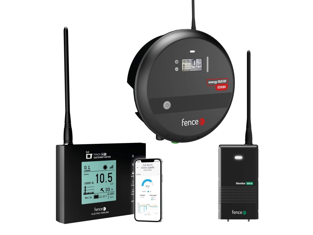 Sada chytrého elektrického ohradníku s RF generátorem a centrální zařízením FENCE WiFi GATEWAY GW100, které umožňuje okamžité připojení zařízení na fencee Cloud a ovládání vzdáleně mobilním telefonem, tabletem nebo počítačem. Generátor elektrického ohradníku Silný kombinovaný generátor fencee energy DUO RF EDX80 je se svým výkonem 8 J vhodný pro dlouhé ohrady s délkou instalace až 80 km, v místech kde je třeba zajistit maximální výkon a spolehlivost. Generátor je univerzálně použitelný pro téměř všechny druhy zvířat, jako jsou koně, ovce, skot, prasata nebo kozy. Své využití najde také při ochraně pozemků nebo úrody před lesní zvěří, divokými prasaty nebo škůdci, jako jsou vydry, kuny a bobři. Je vhodný i pro mláďata díky žluté svorce se sníženým výstupem. Tu můžete připojit na spodní řadu vodiče ohrady nebo na druhou ohradu, ve které se pohybují menší zvířata nebo mláďata. Centrální a ovládací jednotka V sadě elektrického ohradníku je připravena centrální a ovládací FENCE WiFi GATEWAY GW100. Díky ní zařízení připojíte na fencee Cloud a pomocí bezplatné aplikace pro Android a iOS můžete spárovaná zařízení ovládat prakticky odkudkoliv na světě, zaleží pouze internetovém připojení. Přes 1 centrální WiFi Gateway ovládate až 12 RF zařízení. Pro provoz nejsou potřeba žádné registrační poplatky ani SIM karty. Žádné další výdaje, minimalizujete tak vaše náklady na provoz chytrého elektrického ohradníku. Přes Cloud generátory nejen ovládáte, ale také kontrolujete pomocí notifikací, které se ihned zobrazí ve vašem telefonu nebo e-mailu. {QUOTE-607} Díky systému chytré farmy fencee získáte maximální přehled nad vaší elektrickou ohradou kdykoliv a odkudkoliv. Zařízení můžete vzdáleně vypínat, ovládat a monitorovat. V případě nastalého problému dostanete okamžitý alarm do telefonu a na e-mail. Všechny výhody a funkce elektrických ohradníků s aplikací fencee Cloud. Monitorující zařízení jako DÁREK V sadě na vás bude čekat také kontrolní Monitor MX10. Po připojení na elektrickou ohradu měří hodnotu napětí. V případě poklesu pod nastavenou hodnotu odesílá upozornění do centrální Gateway, která ihned spustí on-line alarm o vzniklém poklesu napětí na ohradě. Spárovaný Monitor MX10 ovládáte vzdáleně pomocí mobilní aplikace. Kontrolní monitory mají mnoho způsobů instalace, pokud se chcete dozvědět více, přečtěte si článek o různém zapojení kontrolních Monitorů. Základní a externí RF anténa Chytrá RF zařízení fencee jsou dodávána se základní anténou, která umožňuje dosah komunikace na vzdálenost 10 km. Pro případ, že potřebujete zlepšit kvalitu signálu a dosah přenosu, využijte možnosti instalace externí antény, díky které zvýšíte dosah až na 30 km. Více o montáži externích antén si přečtěte v našem článku. Kombinované napájení Kombinované RF generátory fencee můžete napájet pomocí adaptéru ze sítě 230 V nebo z běžné autobaterie. Tu můžete použít také jako záložní zdroj v případě poruchy nebo výpadku elektrického proudu. Centrální FENCE WiFi GATEWAY GW100 je standardně napájena adaptérem ze sítě 230 V. Pro případ výpadku proudu je opatřena záložním zdrojem, který dodává napětí až 12 hodin. V případě, že potřebujete poradit s výběrem vhodného ohradníku nebo dalších doplňků, neváhejte se obrátit naše technické oddělení, rádi vám pomůžeme. Obsah balení: generátor fencee energy DUO RF EDX80 centrální ovládací zařízení FENCE WiFi GATEWAY GW100 monitorovací zařízení Monitor MX10 ZDARMA Součástí balení generátoru: 1× generátor fencee energy DUO RF EDX80 1× napájecí adaptér 14 V / 2 A 1× základní RF anténa 1× zemnící kabel 150 cm (očko-očko) 1× připojovací kabel 100 cm (očko-srdíčko) 1× bateriový kabel pro připojení energy DUO RF k baterii 1× výstražná tabulka fencee návod k obsluze Součástí balení FENCE WiFi GATEWAY GW100: 1× základní RF anténa 1× napájecí adaptér 14 VDC 1× záložní bateriový zdroj 9,6 V 2× vrut a hmoždinka pro instalaci návod k obsluze Součástí balení Monitoru MX10: 1× základní RF anténa 2× baterie typ C LR14 1× připojovací kabel 100 cm 1× zemnící kabel 150 cm se zemnícím kolíkem 2× stahovací pásky pro snadnou montáž monitoru 1× magnet se šňůrkou návod k obsluze Případové Studie Chytré Farmy fencee Cloud Podívejte se, jak pomáhá Chytrá Farma s aplikací fencee Cloud několika našim zákazníkům, mezi kterými najdete např. zoologickou zahradu, zemědělské družstvo zabývající se chovem skotu, ovčí farmu nebo ranč s koňmi. {CASE-STUDIES:702;515;575;578;604;639;607}