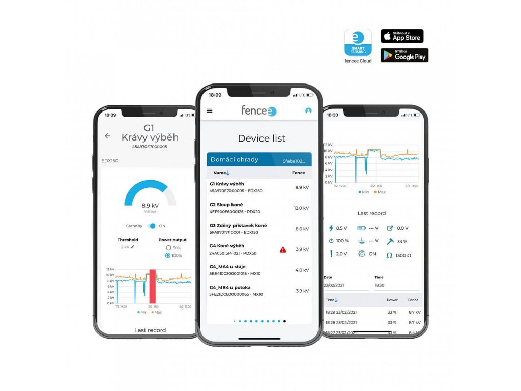 Sada chytrého elektrického ohradníku s RF generátorem a centrálním zařízením WiFi gateway, které umožňuje nepřetržitý přístup do Cloudového úložiště fencee Cloud. Díky tomu získáte možnost ovládat ohradník mobilním telefonem, tabletem nebo z PC kdykoliv a odkudkoliv potřebujete. Neustálý PŘEHLED O VÝKONU OHRADNÍKU s chytrým RF generátorem fencee Kombinovaný chytrý RF generátor fencee power DUO RF PDX20 s výkonem 2 J a dálkovým ovladačem. V případě problému v ohradníku dostanete upozornění na mobil, např. na pokles pod nastavenou minimální hodnotu napětí nebo slabou baterii. Získáte informace o aktuálním stavu ohradníku 24/7, sledování naměřených hodnot za posledních 7 dní. Možnost přepínání výkonu v aplikaci. Generátor je vhodný pro psy, drůbež, kůzlata, koně, skot. Lze použít také pro ochranu proti lesní zvěři, srnkám a liškám. funkce generátorů power DUO RF PDX Prostředník pro NEOMEZENOU KOMUNIKACI centrální zařízení WiFi Gateway Centrální zařízení FENCE WiFi GATEWAY GW100 se po připojení na fencee Cloud a spárování s chytrým RF generátorem stane ovládací a kontrolní bránou, která je prostředníkem v komunikaci mezi vaším telefonem a RF generátorem. Na jednu Gateway lze přidat až 12 zařízení, které podporují připojení na fencee Cloud. Prostřednictvím Gateway ovládáte jednotlivá zařízení ohrady z telefonu, tabletu, nebo PC pomocí bezplatné aplikace fencee Cloud. {QUOTE-639} Cloudové úložiště sbírá data od RF generátorů a kontrolních monitorovacích zařízení Monitor MX10. Díky centrální gateway můžete jednoduše nastavovat a ovládat jednotlivá zařízení, pomocí mobilní aplikace nebo z webového rozhraní aplikace. Prostřednictvím Cloudu generátory ovládáte, ale také kontrolujete pomocí online notifikací, které se ihned zobrazí ve vašem telefonu nebo e-mailu. funkce fence wifi gateway gw100 Cloudové ukládání dat a nepřetržitý PŘÍSTUP ODKUDKOLIV Sledujte své elektrické ohradníky v reálném čase a dostávejte online upozornění v případě poruchy. Díky aktuálním informacím v mobilním telefonu minimalizujete vznik nepříjemných situací. Získejte další benefity, jako je zakreslení ohrad do mapových podkladů, nastavení virtuálních plotů a sdílení zařízení a přidělování práv k ovládání určitých funkcí. Malý a lehký dálkový ovladač součástí balení Praktický dálkový ovladač PDX pro operativní úkony, ON/OFF a přijímání zvukového alarmu na vzdálenost 10 km, s externí anténou až 30 km. Přehledný displej ovladače s nejdůležitějšími informacemi o ohradě. Zobrazování kvality signálu, výkonu a aktuální kapacity baterie generátoru. Praktické a nárazuvzdorné provedení dálkového ovladače, který se hodí do pracovních podmínek poblíž elektrické ohrady. Ovladač s baterií CR2 3V vydrží na celou sezonu. Základní a externí RF anténa, komunikace BEZ POPLATKŮ Komunikace mezi RF zařízeními probíhající pomocí RF technologie. Bezplatná rádiová frekvence - žádné náklady na provoz. Standardní dosah mezi gateway a RF generátorem u dodávaných základních RF antén je 10 km. V případě potřeby navýšení dosahu signálu využijte externí anténu, díky které lze zvýšit kvalitu přenosu a dosah signálu mezi zařízeními na vzdálenost až 30 km. o provozu a montáži zařízení s externí anténou Kombinované napájení pro MAXIMÁLNÍ FLEXIBILITU Kombinované generátory je možné napájet pomocí přiloženého adaptéru ze sítě 230 V nebo z běžné autobaterie 12 V. Tu můžete použít také jako záložní zdroj v případě výpadku proudu. Gateway je opatřena záložním zdrojem, který dodává napětí až 12 hodin v případě výpadku elektrického vedení. Pokud se potřebujete před nákupem poradit, neváhejte se na nás obrátit, rádi vám poradíme. Obsah balení: generátor fencee power DUO RF PDX20 centrální ovládací zařízení FENCE WiFi GATEWAY GW100 Součástí balení generátoru power DUO RF PDX20: generátor fencee dálkový ovladač generátoru 1× baterie CR2 3V 1× napájecí adaptér fencee DUO 14 V 1,5 m 1× zemnící kabel 150 cm (očko-očko) 1× připojovací kabel 100 cm (očko-srdíčko) 1× kabel bateriový fencee DUO 170 cm 1× výstražná tabulka fencee 1× základní RF anténa návod k obsluze Součástí balení FENCE WiFi GATEWAY GW100 1× základní RF anténa 1× napájecí adaptér 14 VDC 1× záložní bateriový zdroj 9,6 V 2× vrut a hmoždinka pro instalaci návod k obsluze Případové Studie Chytré Farmy fencee Cloud Podívejte se, jak pomáhá Chytrá Farma s aplikací fencee Cloud několika našim zákazníkům, mezi kterými najdete např. zoologickou zahradu, zemědělské družstvo zabývající se chovem skotu, ovčí farmu nebo ranč s koňmi. {CASE-STUDIES:702;515;575;578;604;639;607}