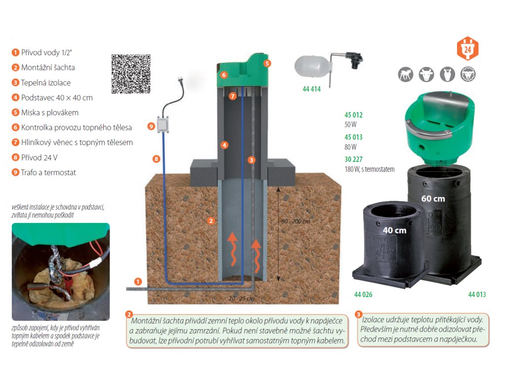 Při použití bez možnosti vybudování zemní šachty, je vhodné podstavec vyplnit tepelnou izolací (minerální vatou) až cca 10 cm pod topné těleso tak, aby topné těleso nemuselo ohřívat vzduch v podstavci, který se ochlazuje od podložky. Přívodní trubka se pak musí ohřívat topným kabelem vždy (není součástí dodávky). Napáječku je možné doplnit termostatem, aby se napáječka nepřehřála (není součástí dodávky. Termostat naleznete v souvisejících produktech). Provoz topného tělesa je signalizován kontrolním světlem.