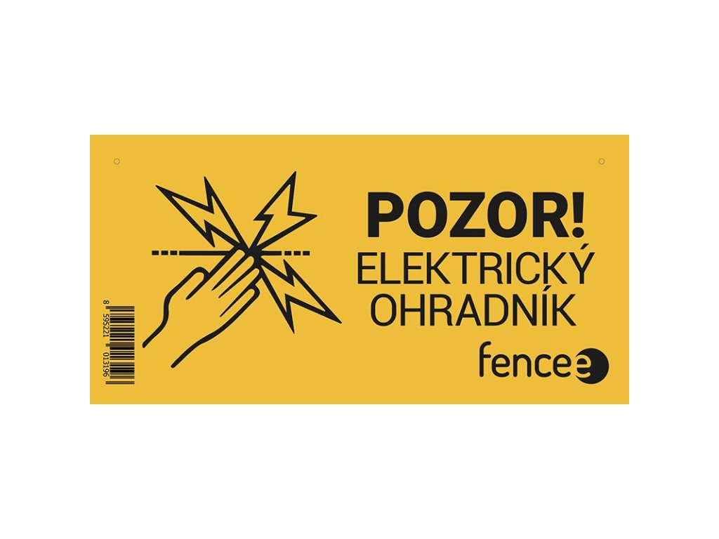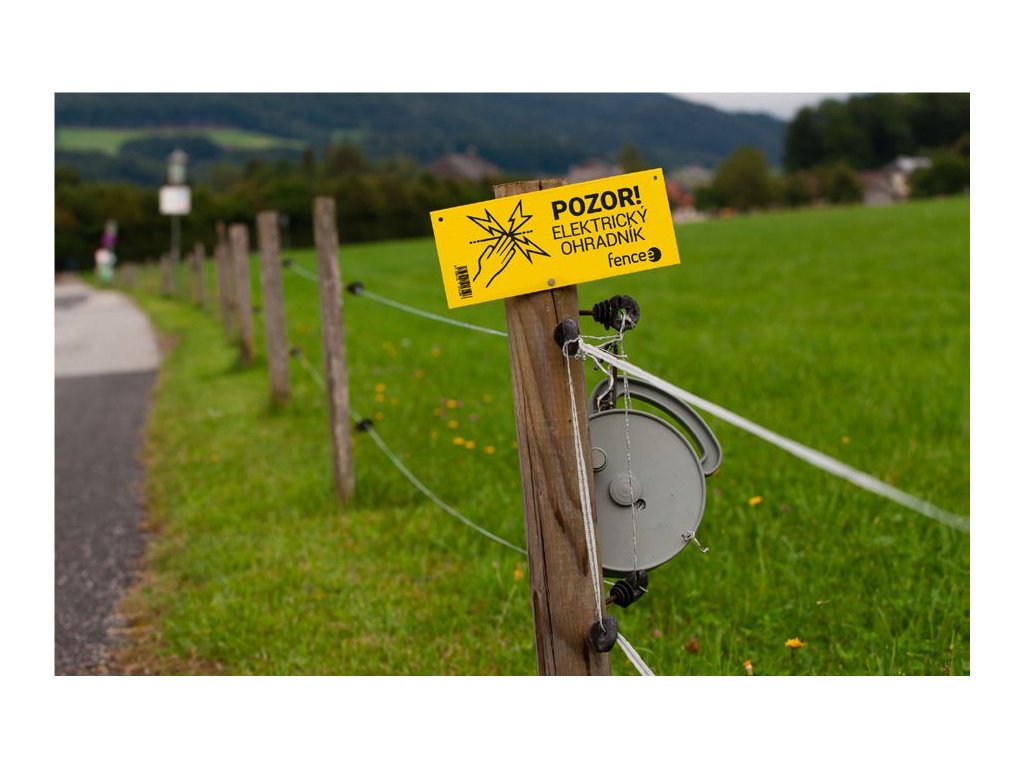 Plastová výstražná tabulka fencee - POZOR! ELEKTRICKÝ OHRADNÍK Podle platné normy ČSN EN 60335-2-76 ed. 2 musí být veškeré úseky elektrického ohradníku instalované podél veřejné komunikace označeny výstražnými tabulkami připevněnými na sloupky nebo na ohrazení a viditelnými z každého místa v pravidelných intervalech komunikace.
